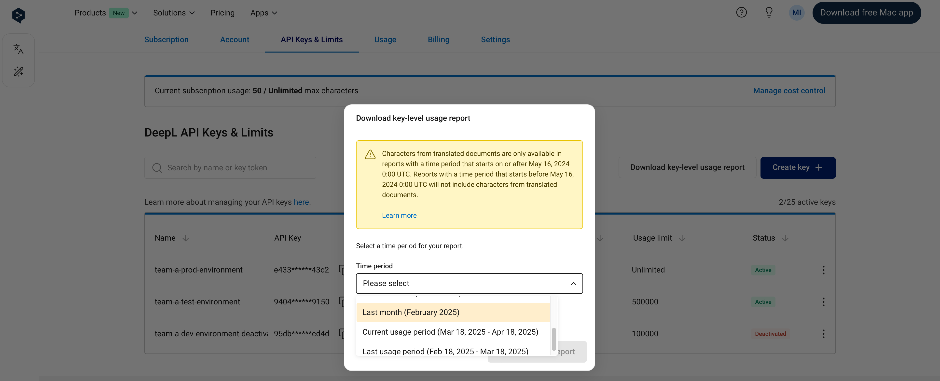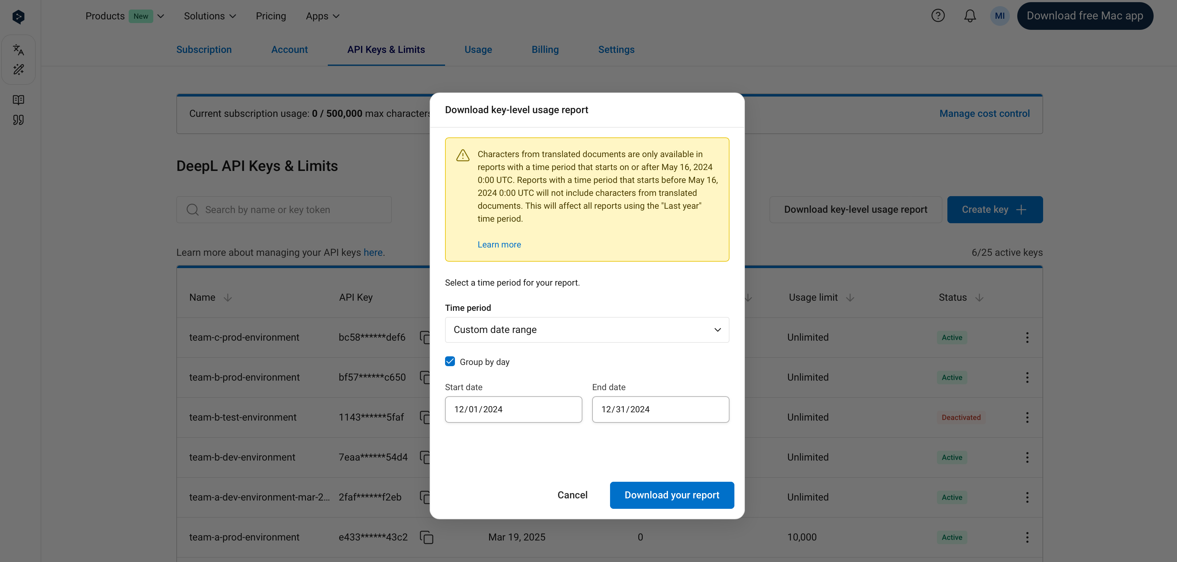 It’s possible to set an API key-level usage limit. Key-level limits restrict the number of total characters (across text translation, document translation, and text improvement) that can be consumed by an API key in a one-month usage period. You can see the dates of your current usage period in the Usage tab. For example, if you set a key-level usage limit of 1,000,000 characters, the API key will not consume more than 1,000,000 characters per usage period. In the “API Keys & Limits” tab, the “Characters consumed” column in the API keys table shows the number of characters consumed by an API key in the current usage period. The character count will “reset” at the start of the next usage period, at which point the key will again be able to consume characters. As with subscription-level cost control:- You’ll receive notification emails when 80% and 100% of a key-level limit has been reached